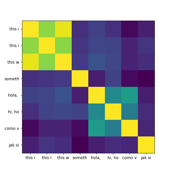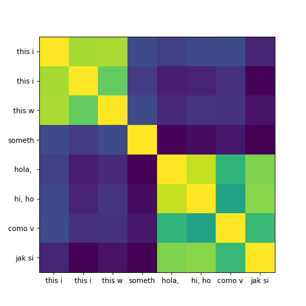 What do we notice? The three similar English phrases in the top left remain strongly coherent. The Spanish and English "how are you" phrases are recognized as similar. But now Polish is large lost in relation to the other languages.