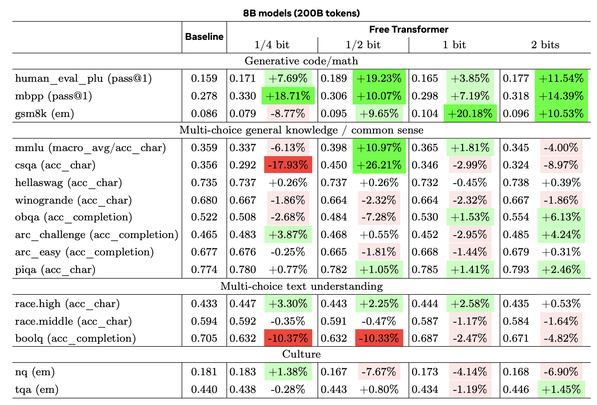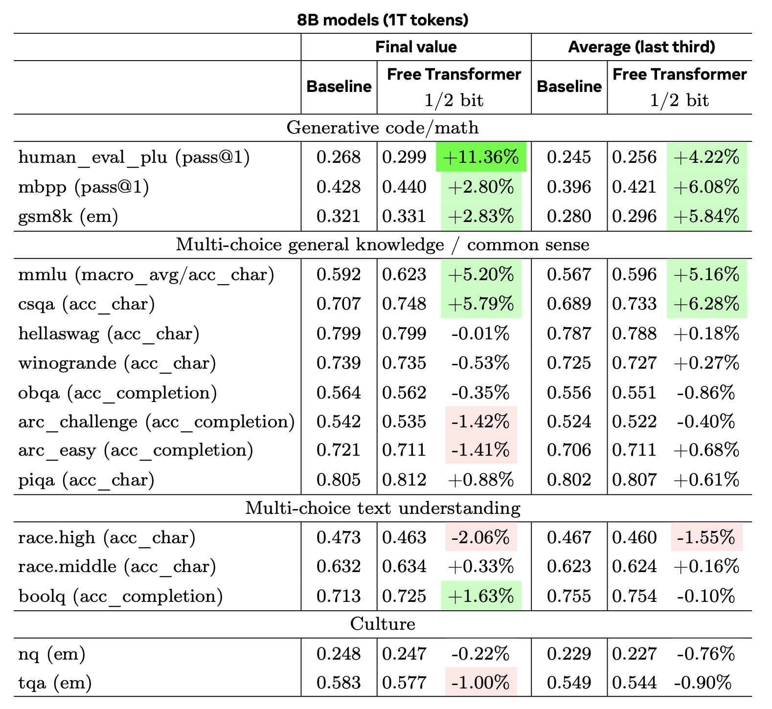 The paper compared a 1.5B model (that I don't discuss here) and an 8B Llama-3 type model with 32 layers. The 8B model was given either 200B tokens or 1T tokens. Training was tuned for the baseline model and then also used for the Free Transformer variant. These models were then applied to a variety☆ of benchmarks.